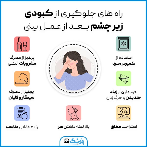 روشهایی برای ورم و کبودی زیر چشم بعد از عمل بینی آورده شده است که عبارتند از:
