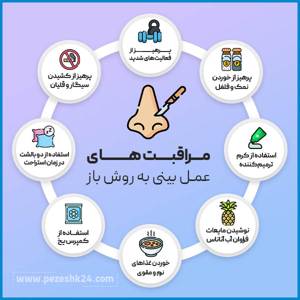 مراقبت های بعد عمل بینی در روش باز یکی از حیاتی ترین مراحل این عمل است که میتواند نتایج آن را به شدت تحت تاثیر قرار دهد. همچنین هیچ تفاوتی بین مراقبتهای بعد از عمل جراحی بینی باز و بسته وجود ندارد. در اینجا به برخی از مراقبت های بعد عمل بینی باز اشاره شده است: