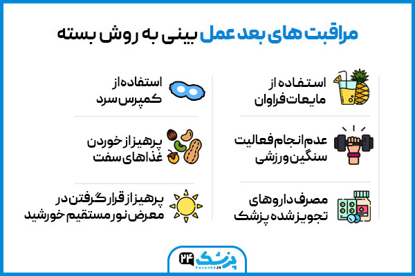 مراقبت های بعد از جراحی بینی بسته با باز تفاوتی ندارد ولی به دلیل محدود بودن تغییرات در این روش دوره نقاهت جراحی بینی بسته کمتر است. در ادامه به مراقبت های بعد جراحی بینی به روش بسته اشاره شده است: