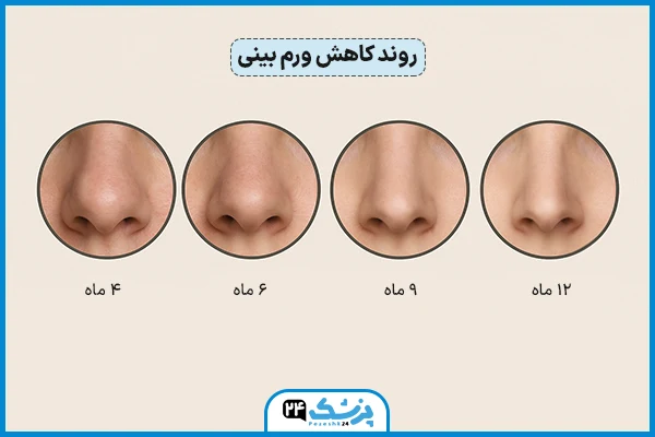 ورم شش ماه بعد از عمل بینی طبیعی است، ولی به طور کلی نیمی از تورم بینی در 3 ماه اول کاهش مییابد. به دلیل اینکه تخلیه لنفاوی و بازآرایی کلاژن در بافت نرم بینی زمانبر میباشد، مقداری ورم قابل انتظار است. بیشترین کاهش ورم در 3 ماه اول بعد جراحی اتفاق میافتد. ولی ورم باقی مانده به ویژه در نوک و کنار پره های بینی میتواند 6 تا 12 ماه ادامه داشته باشد. شدت و دوام ورم به نوع پوست، میزان دستکاری غضروف و ضخامت پوست بستگی دارد.