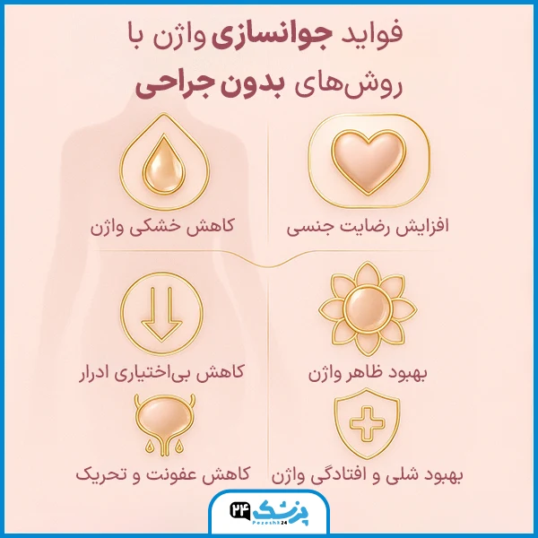 جوانسازی غیرجراحی واژن: روشهای غیرجراحی شامل لیزرهای فرکشنال CO₂، لیزر Er:YAG، رادیوفرکانسی (مثلاً ThermiVa یا Votiva)، تزریق ژل به واژن، تزریق چربی به واژن و درمانهای تزریقی مانند PRP (معروف به O-Shot) هستند.