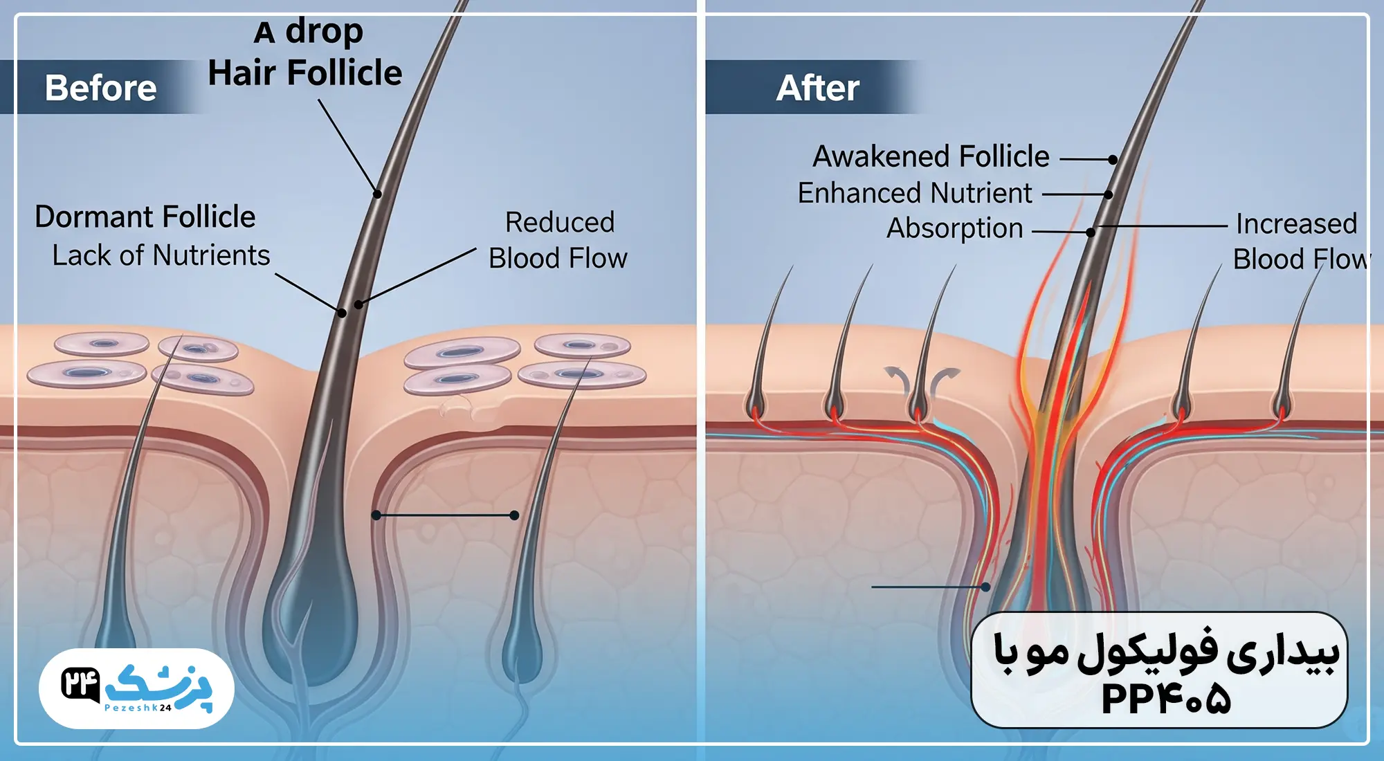 برخلاف درمانهای رایج، PP405 هورمونی نیست. در عوض، با هدف قرار دادن متابولیسم سلولهای بنیادی فولیکول مو، آنها را از حالت “خواب” بیدار کرده و وادار به تولید مجدد مو میکند. به همین دلیل، از آن به عنوان یک درمان “ترمیمی“ یاد میشود، نه فقط یک روش “نگهدارنده”.
