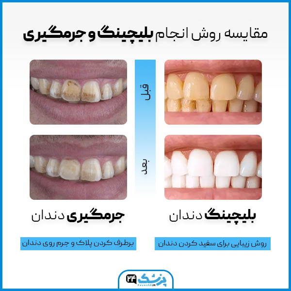 - در جرمگیری، تنها پلاکها و رسوبات روی دندان برداشته میشوند و تغییر رنگ کمی رخ میدهد، اما بلیچینگ جنبه زیبایی داشته و بهطور خاص دندانها را سفیدتر میکند.