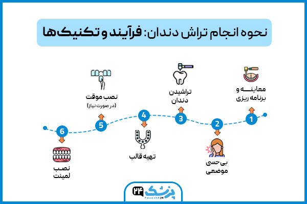 - نصب موقت (در صورت نیاز): در برخی موارد، دندانپزشک ممکن است برای محافظت از دندانهای تراشیده شده تا زمان آماده شدن لمینتهای دائمی، از روکشهای موقت استفاده کند.